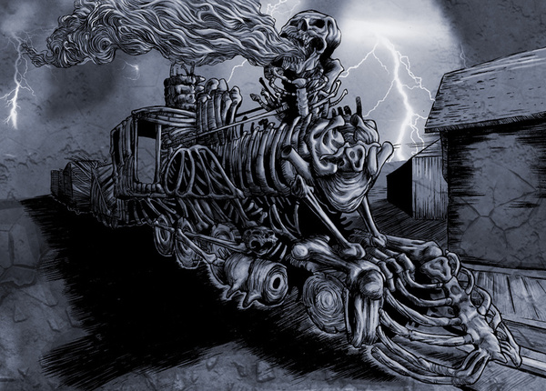 It wasn’t until last year that I saw ‘my train’ brought to life. Only it wasn’t for ‘Shovel-Man Joe’, but rather ‘Black Train Blues’ by James A Moore (I’m a huge fan – check out his stuff) for Midnight Echo Issue 9. The illustration is phenomenal, and perfectly captured both James’ train, and the vision I had of Shovel-Man Joe’s train. When I first saw it, I said: “That’s my train!”